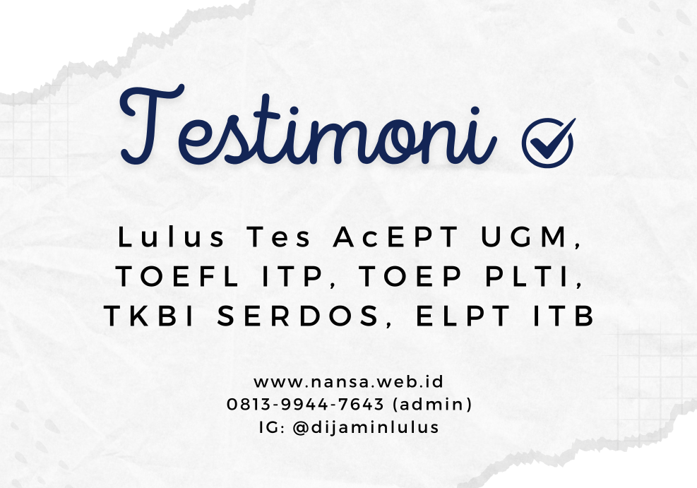 Testimoni LULUS Tes Acept UGM, TOEFL, TOEP, ELPT, TKBI SERDOS