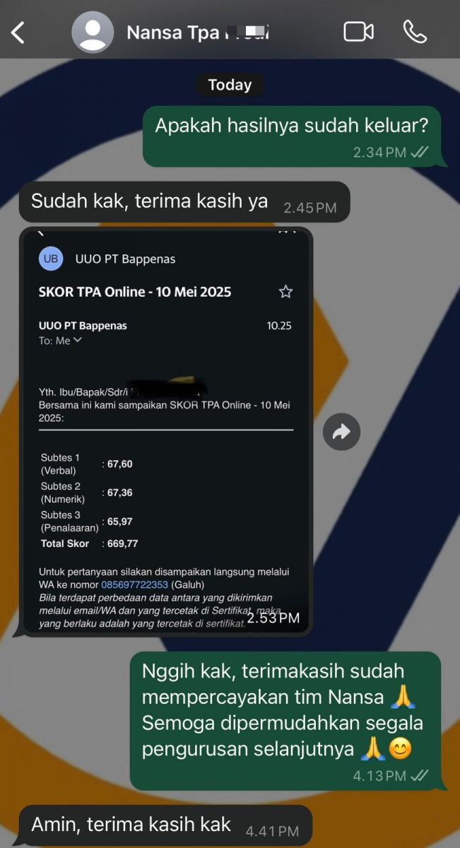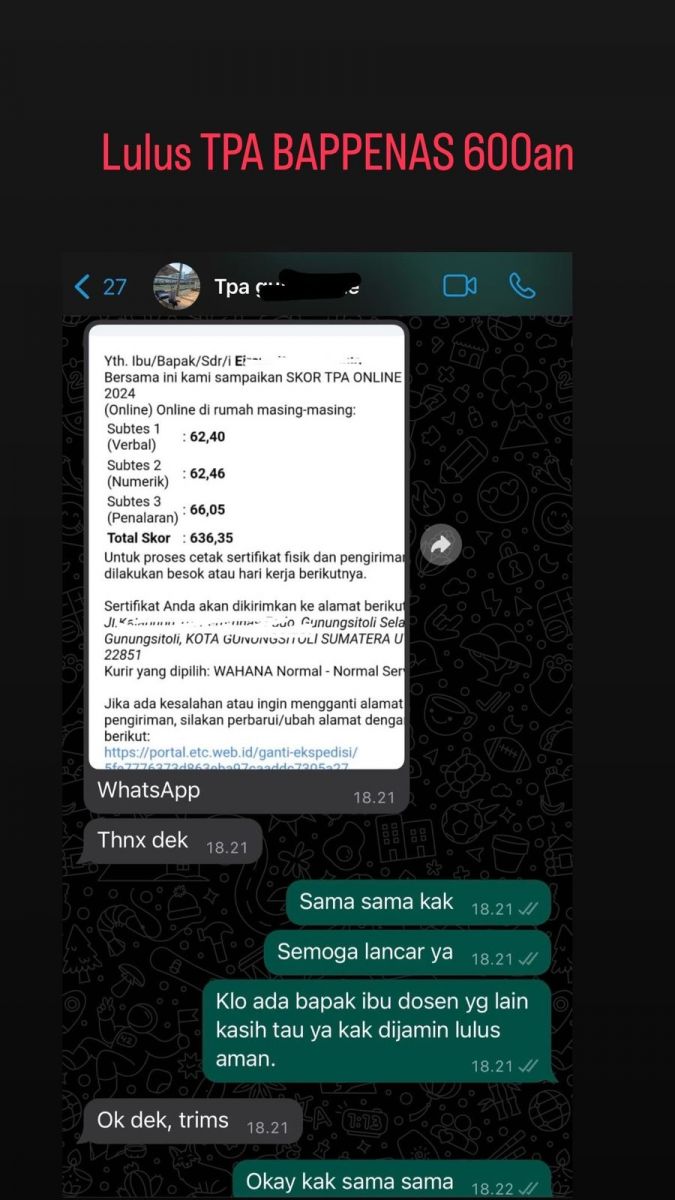 Testimoni LULUS Tes PAPs TPDA TKDA SERDOS TPA Bappenas