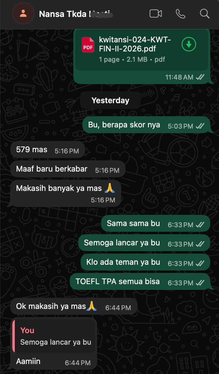 Testimoni LULUS Tes Acept UGM, TOEFL, TOEP, ELPT, TKBI SERDOS