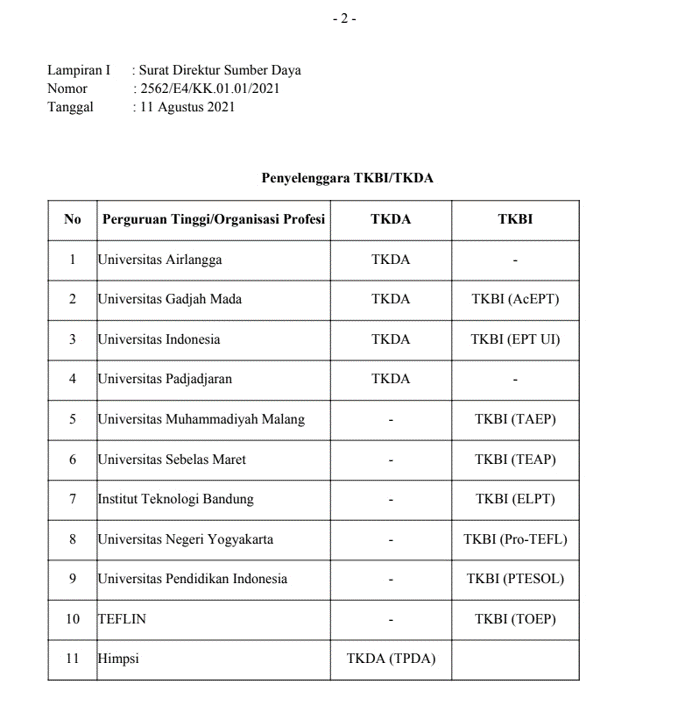 | TEFLIN (PLTI) | – | TKBI (TOEP) | Lihat |
